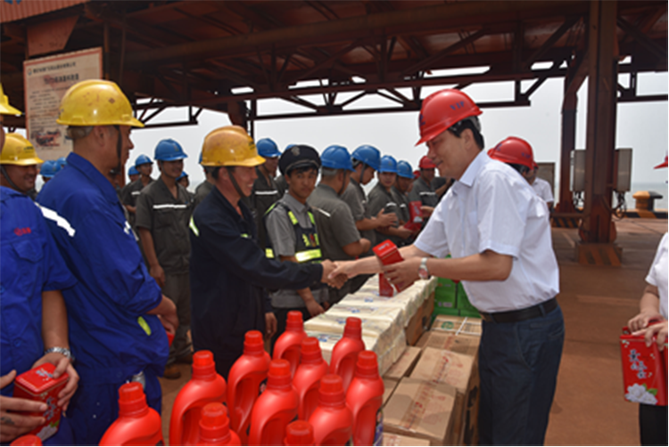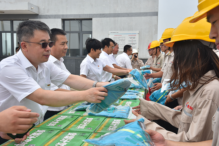7月27日,曹妃甸港集团股份有限公司党委副书记、总经理刘维胜带领公司党政领导班子成员和工会委员来到各作业公司,向奋战在生产一线的职工、协力作业人员、保安等现场发放了饮料、防晒衣等防暑慰问品。