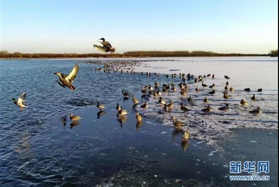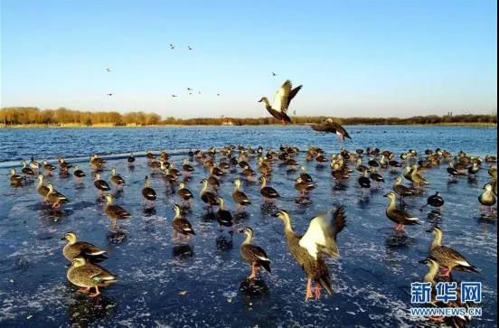 近日,大批水鸟飞临河北省唐山市南湖景区栖息,形成一道靓丽的风景线。