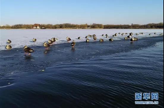 12月14日,水鸟在唐山南湖的冰面上栖息(无人机拍摄)
