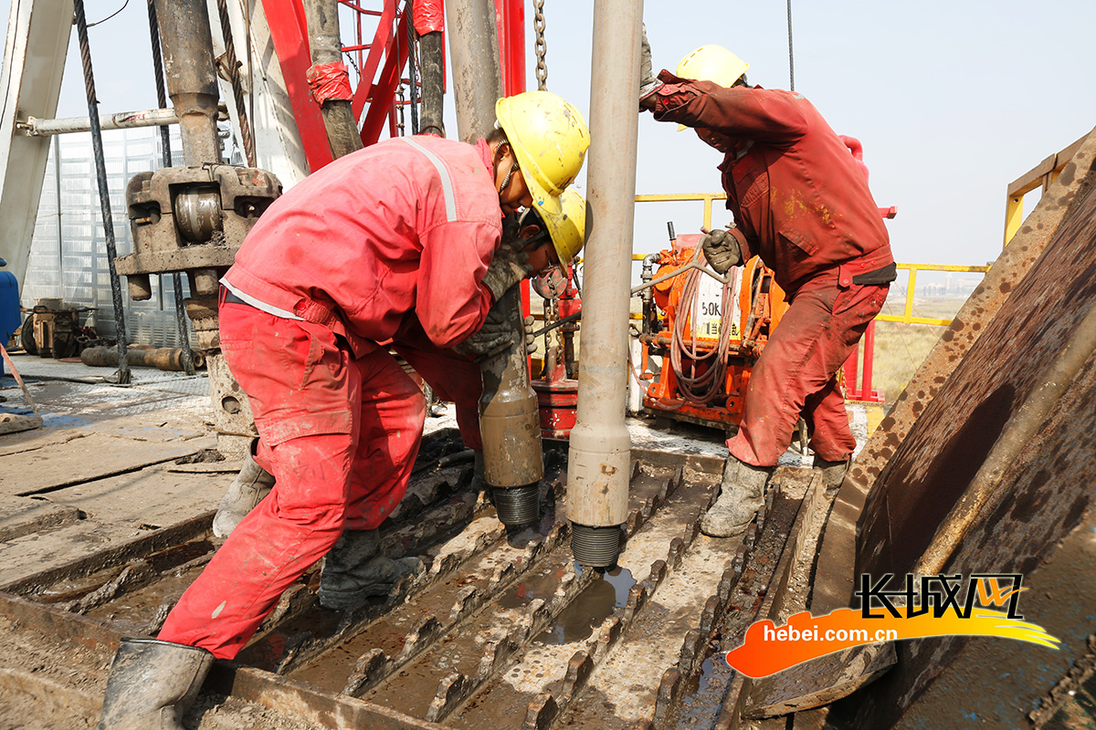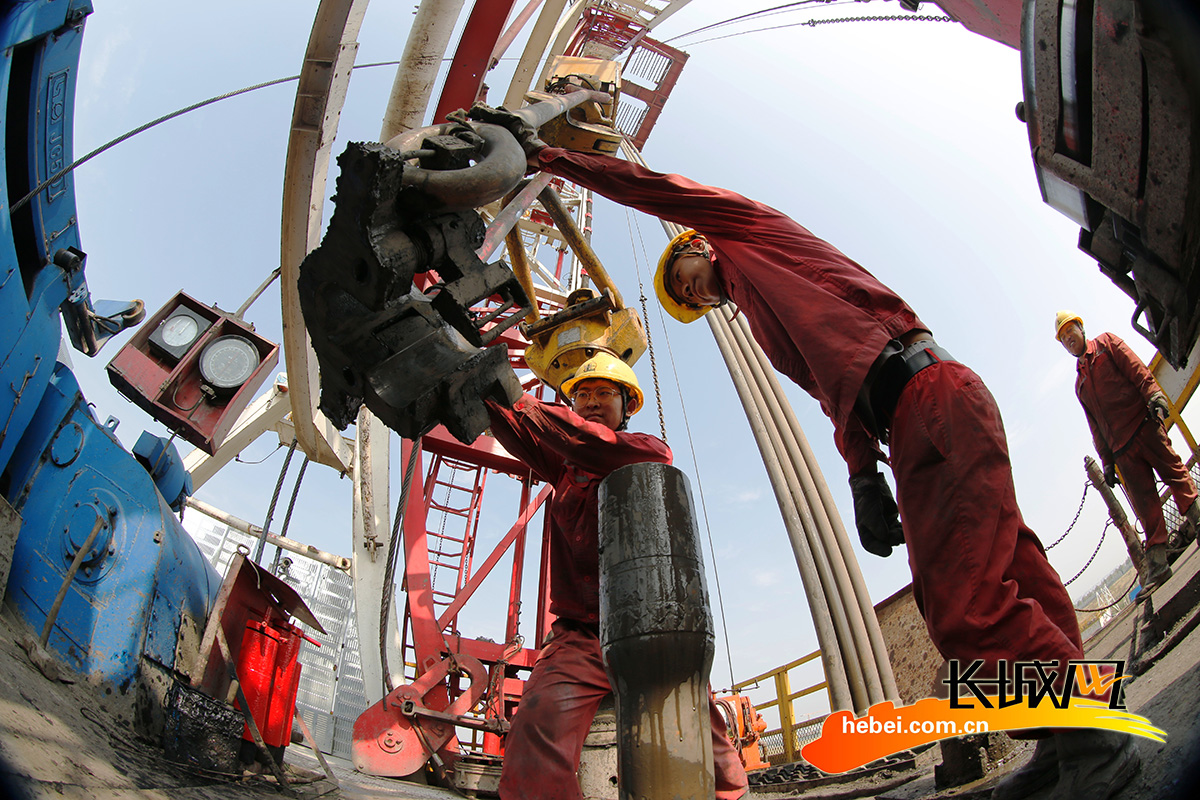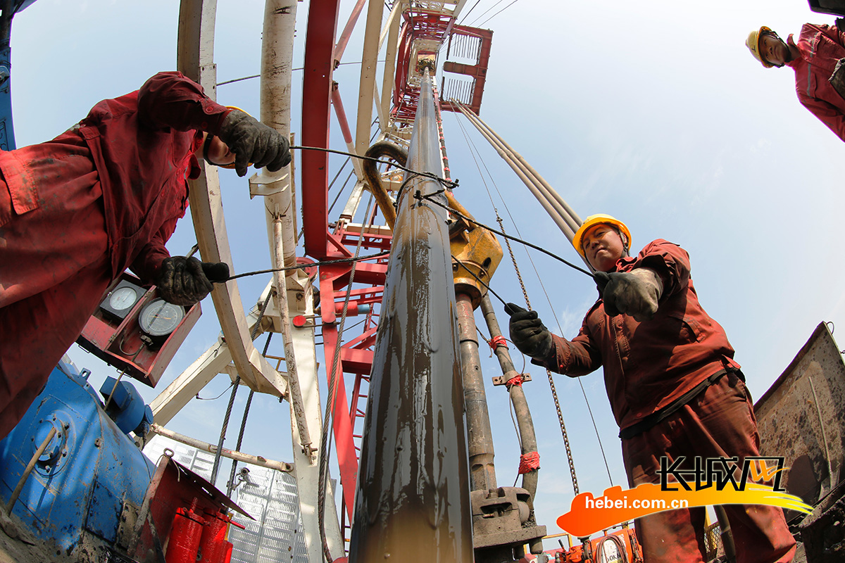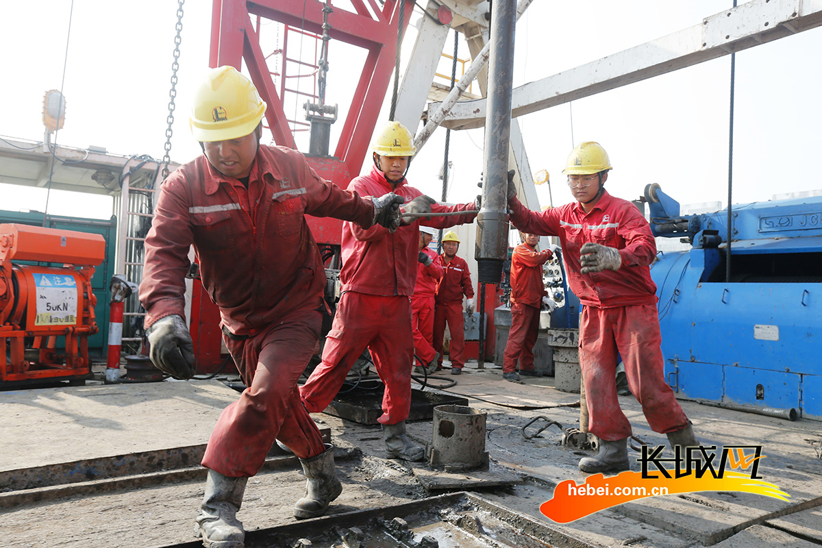 10月10日,在位于河北唐山的中国石油冀东油田高63-53井钻井现场,钻工们正抓紧时间进行二开钻进。