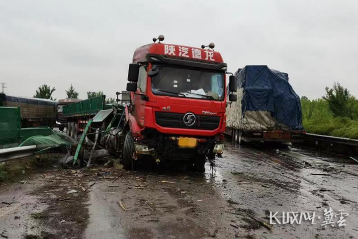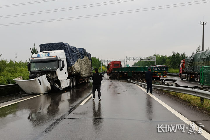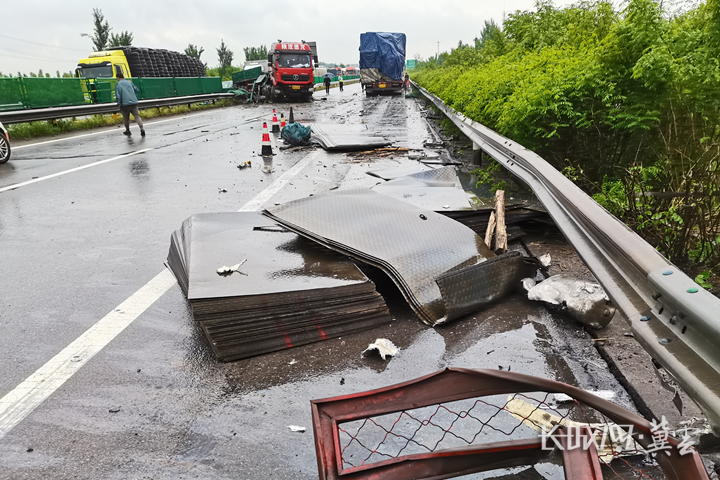 5月6日14时33分,唐津高速丰南段天津方向12公里+610米处,一辆拉运钢板的冀B牌照重型货车行驶途中突然失控,侧滑撞上中央护栏并卡在中央隔离带上,车上所载钢板滑落砸到对向车道正常行驶的吉A牌照重型货车,造成吉A货车驾驶员受伤,两车及所载货物受损,路产受损。