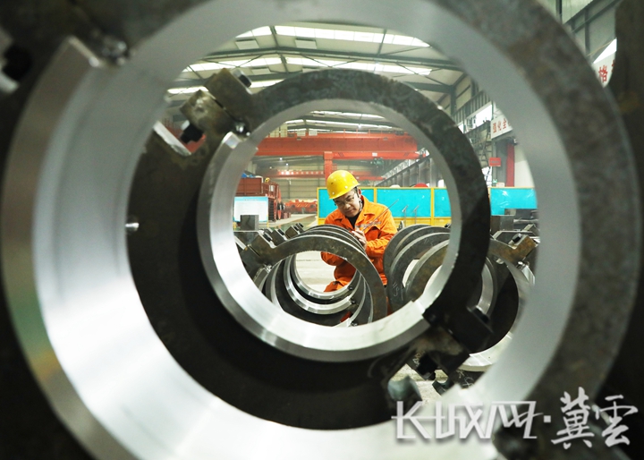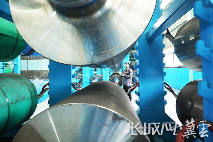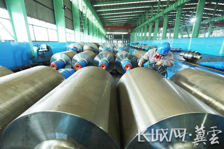 工人在丰润区一家轧辊生产企业车间工作。