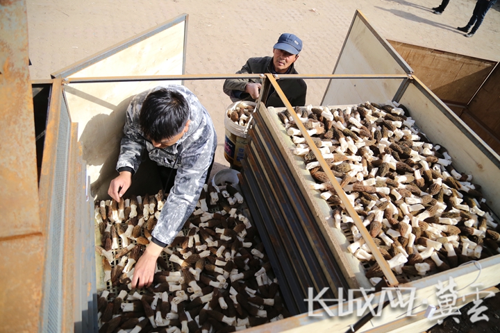 农民在分层摆放待烘干的新鲜羊肚菌。吴海民 摄