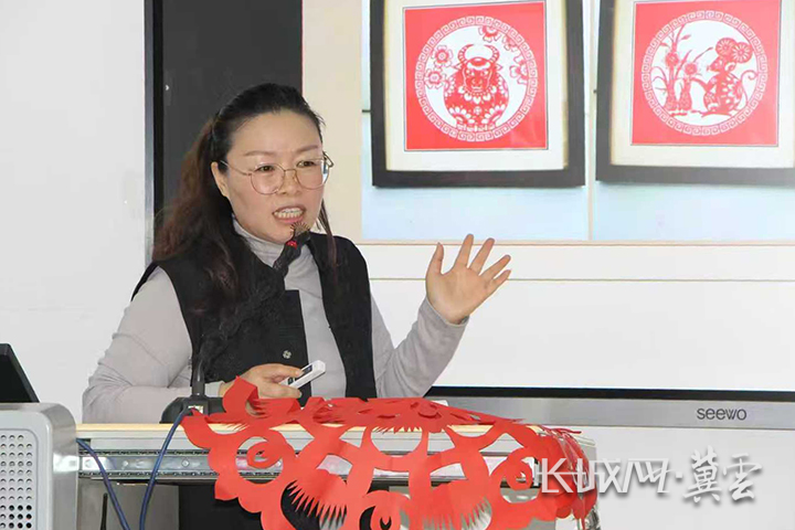 结合自身多年的传承与教学经验,李旺重点分享了唐山地域剪纸的特色。“咱们唐山剪纸既有北方剪纸的粗犷大气,又带着冀东民俗的细腻灵动——比如‘喜花’里的‘鱼戏莲’纹样,既藏着‘年年有余’的吉祥寓意,也体现了本地的农耕文化底色。”她现场展示了多幅唐山传统剪纸作品,从婚俗剪纸的“龙凤呈祥”到节庆剪纸的“福字团花”,每一件作品的纹样、配色都对应着独特的文化语境,让师生们读懂了“剪纸是纸上的民俗诗”。