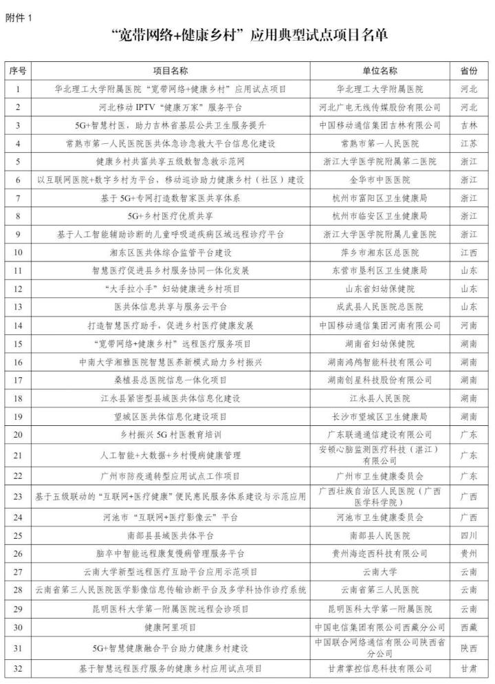 1.“宽带网络+健康乡村”应用典型试点项目名单
