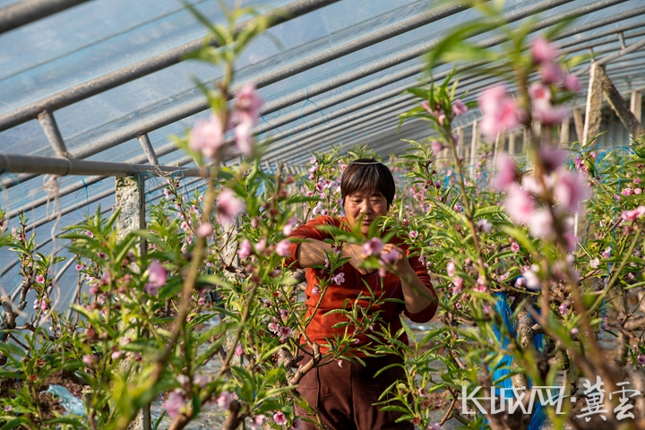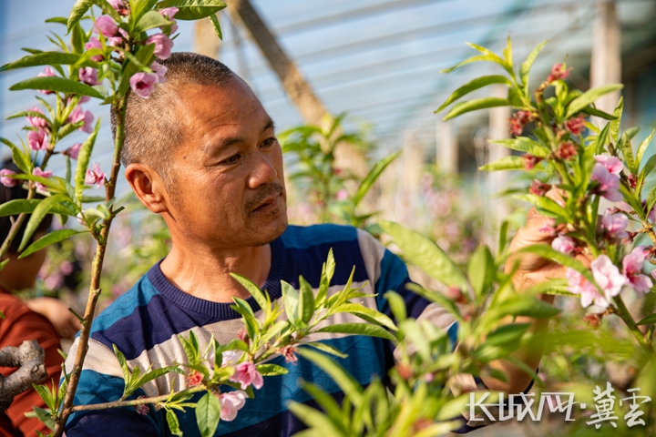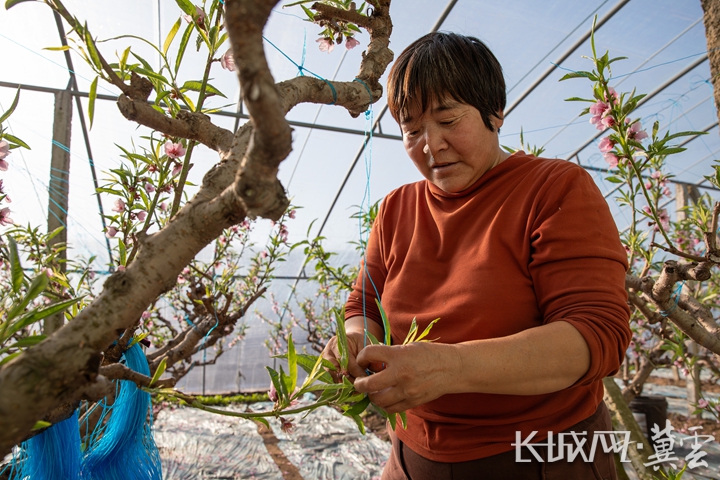 技术人员正在检查桃棚桃花长势情况。赵江涛 摄