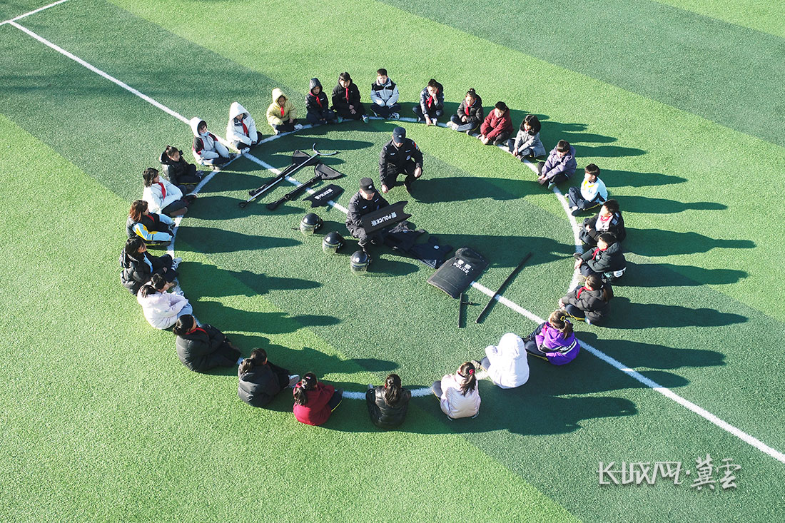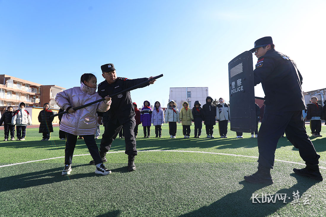1月10日,丰润区公安局的警察在丰润区东实验小学指导学生使用防暴器材。