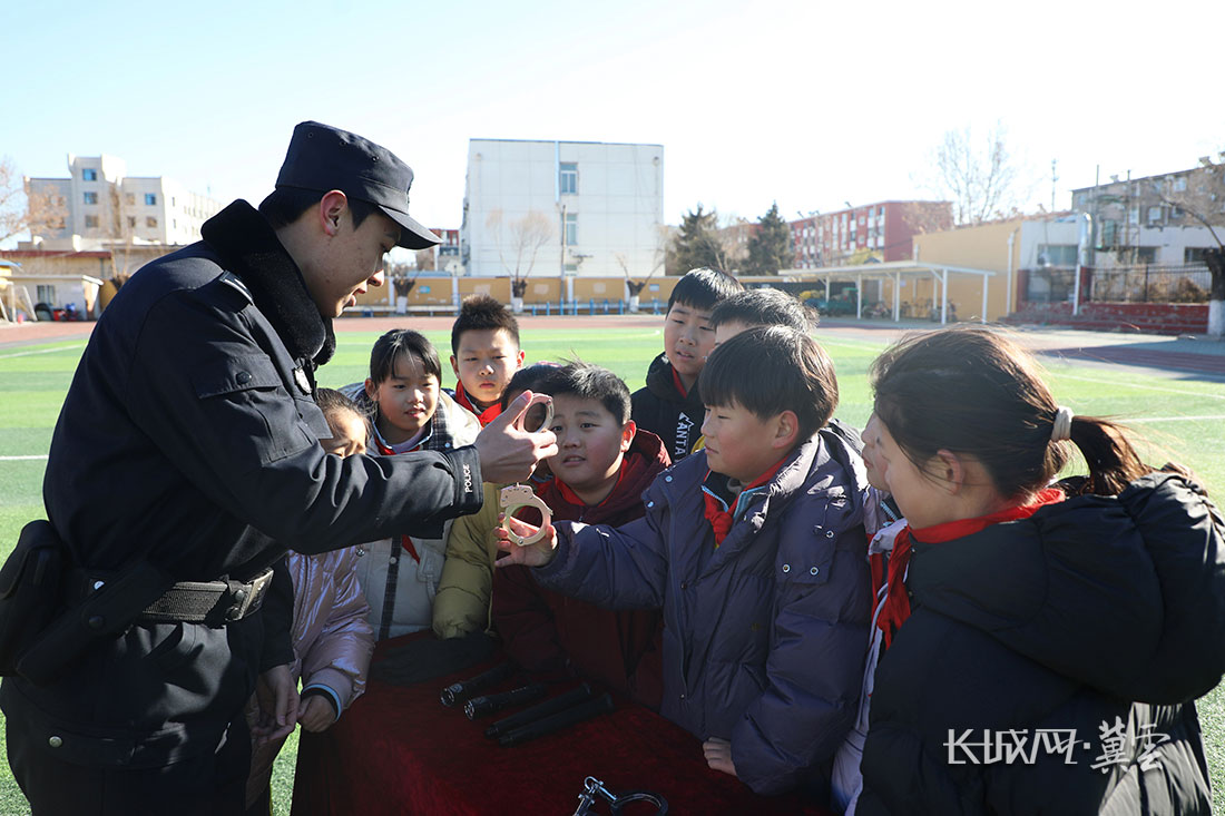 1月10日,丰润区公安局的警察在丰润区东实验小学为学生介绍警用装备。