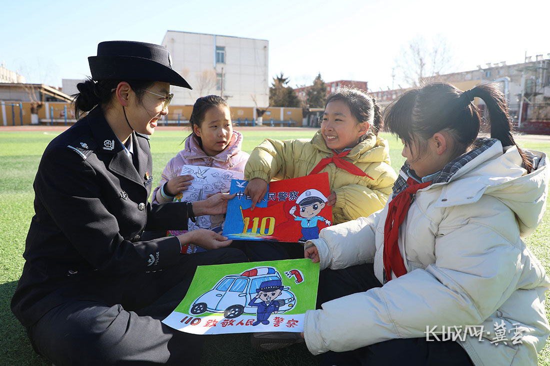 1月10日,在丰润区东实验小学,学生把创作的绘画作品送给警察。