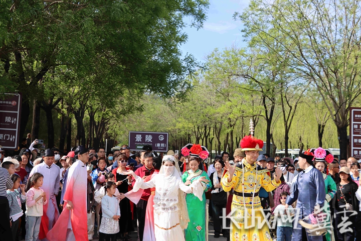 游客在清东陵景陵停车场观看演出。清东陵景区供图