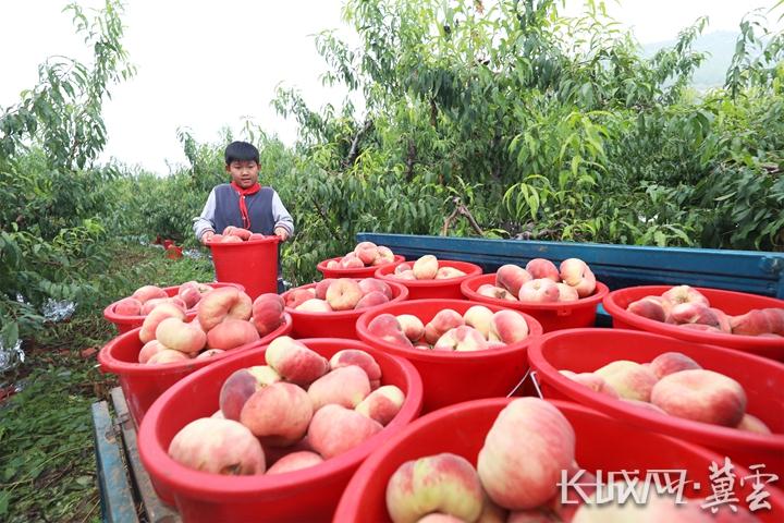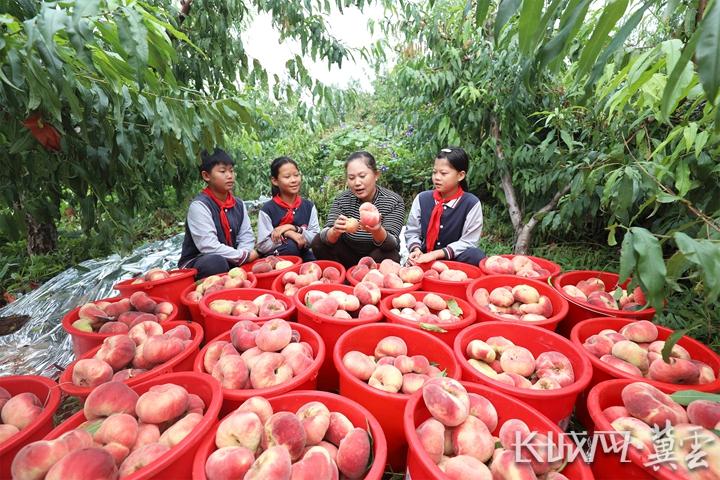在丰润区火石营镇西马庄户村,果农在教东吕各庄小学学生如何分拣蟠桃。