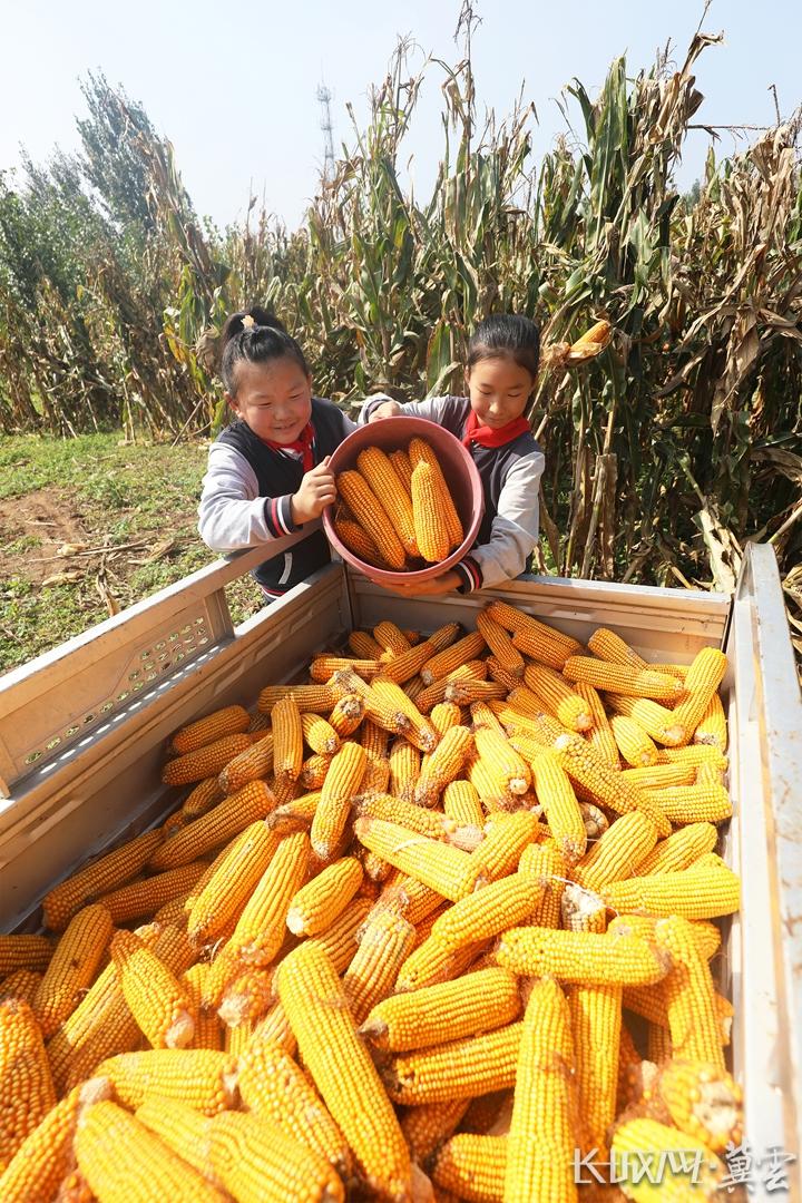 学生在帮助农家将收获的玉米装车。