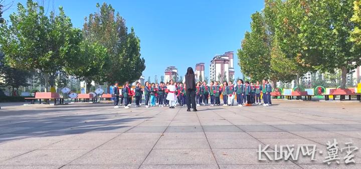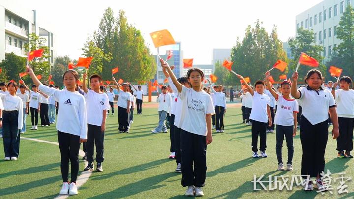 “五星红旗迎风飘扬,胜利歌声多么响亮……”摆字环节过后,合唱《歌唱祖国》的旋律响起。小学生挥舞小国旗,稚嫩却嘹亮的歌声化作爱的洪流。悠扬歌声飘荡在校园上空,感染着在场每一个人,家国情怀在旋律中悄然传递。