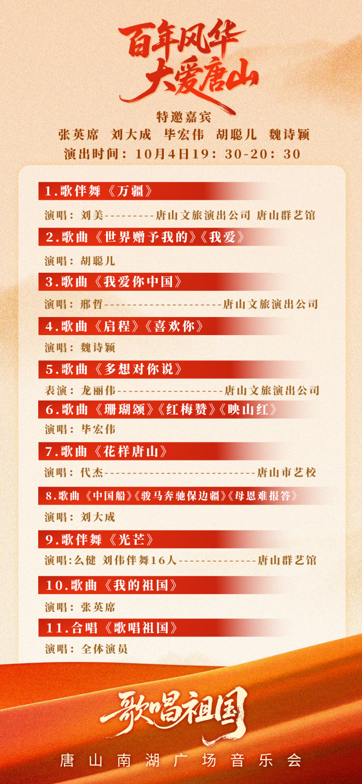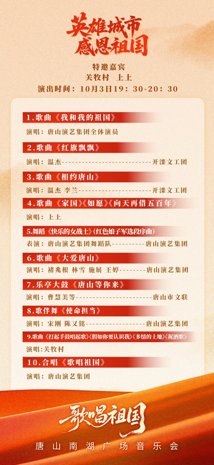 10月2日至4日,歌唱祖国·唐山南湖广场音乐会将在南湖丹凤朝阳广场举行。众多国内知名歌唱家齐聚南湖,用最美的歌声表达对祖国的深情祝福。演出时间均为当日19:30至20:30,市民及游客可免费入场。