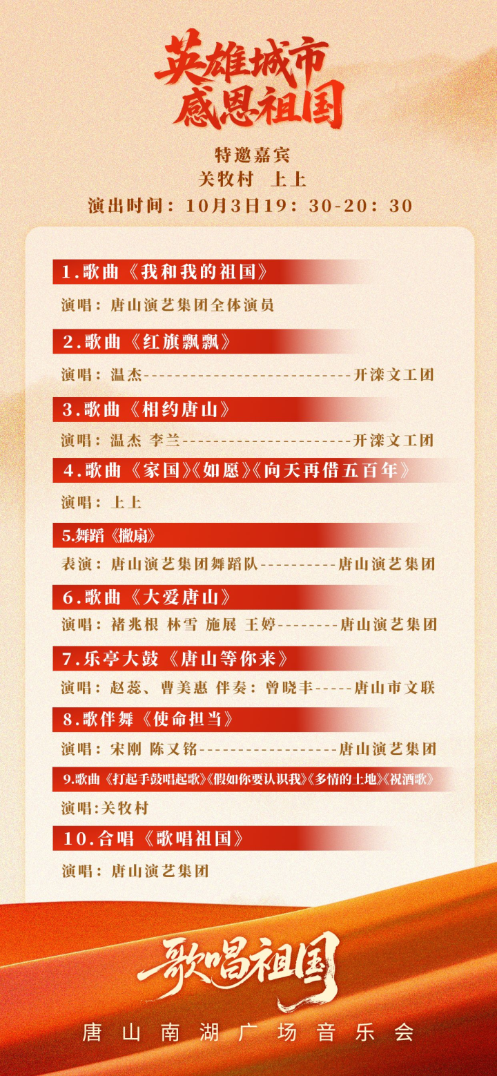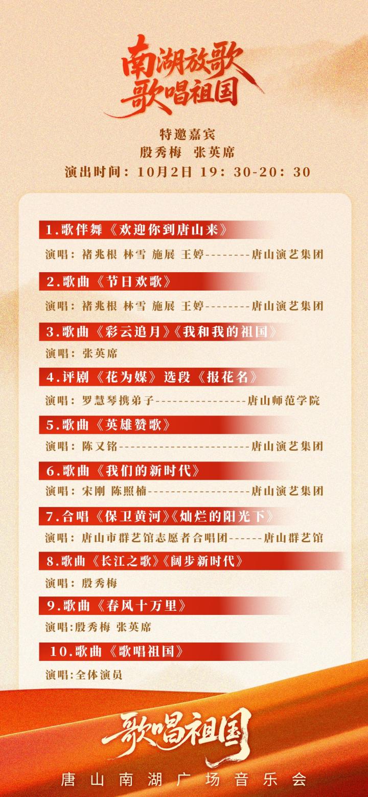 10月2日至4日,歌唱祖国·唐山南湖广场音乐会将在南湖丹凤朝阳广场举行。众多国内知名歌唱家齐聚南湖,用最美的歌声表达对祖国的深情祝福。演出时间均为当日19:30至20:30,市民及游客可免费入场。