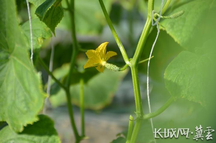 大棚内刚挂果的小黄瓜顶着嫩黄的花萼。王喜增 摄