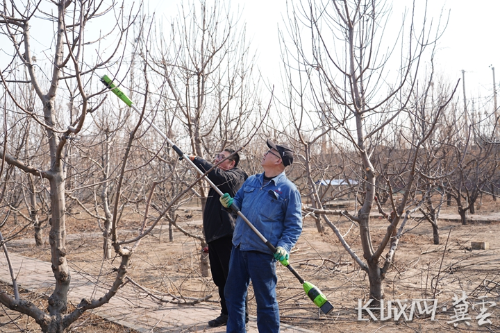 唐山市开平区学生综合实践服务中心老师给果树剪枝。