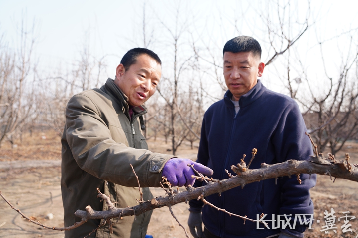 唐山市开平区学生综合实践服务中心老师为农户讲解果树剪枝的目的和基本原则。