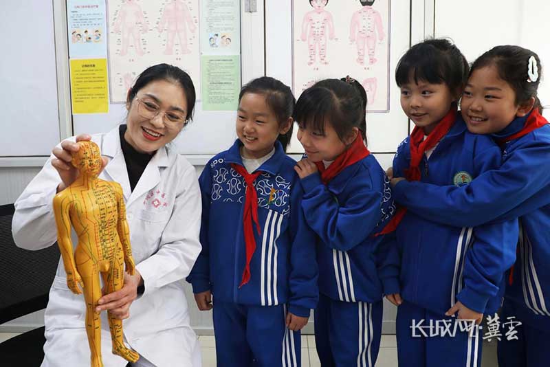 在丰润区中医医院,中医师向丰润区第二实验小学学生介绍人体穴位的基本常识。