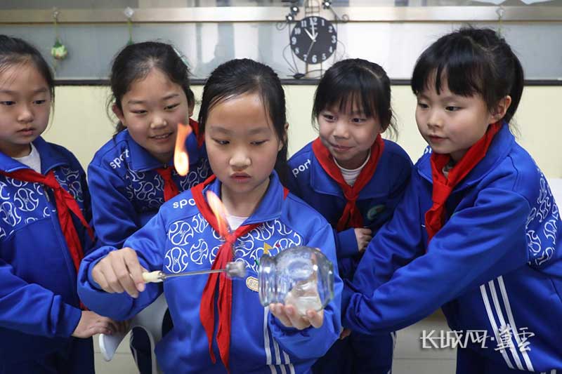 丰润区第二实验小学学生在体验“拔火罐”。