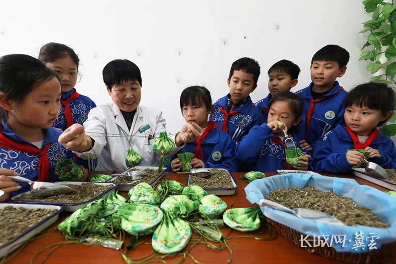 丰润区中医医院,中药师指导丰润区第二实验小学学生制作中药香囊。
