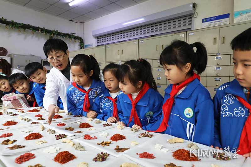 在丰润区中医医院,中药师给丰润区第二实验小学学生讲解中草药种类和功能。