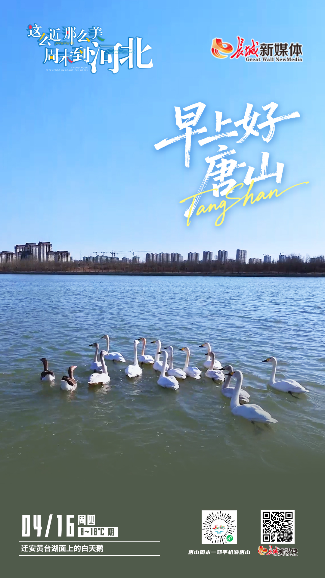 美丽唐山丨2026年4月16日(迁安黄台湖面上的白天鹅)