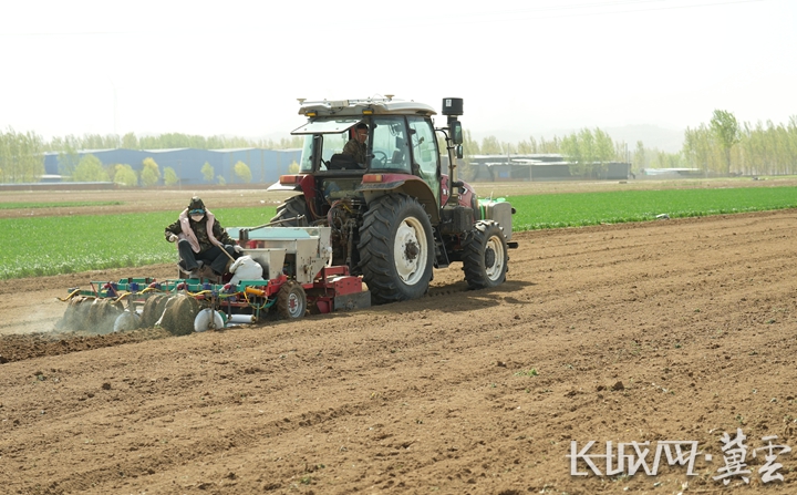 迁安市彭店子镇南坵村的农民在田间使用农机播种花生。梁玉水 摄