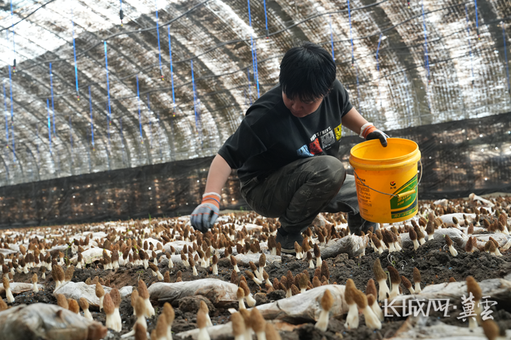 工人们正熟练地将羊肚菌采下装筐。